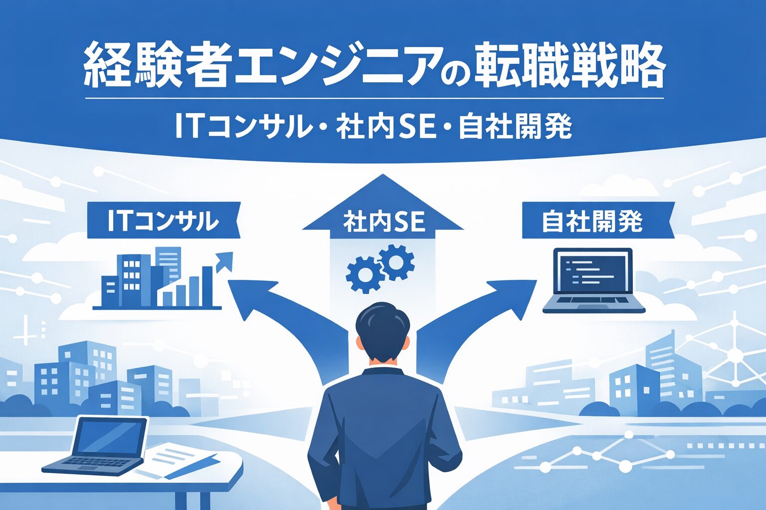 この記事では、経験者エンジニアのキャリアアップ転職をテーマに、ITコンサル・社内SE・自社開発という代表的な選択肢を比較しながら、それぞれに向いている人の特徴や、転職エージェントの選び方を整理していきます。